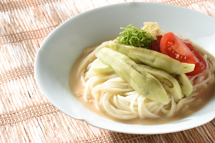 茹でなすのごま豆乳つゆぶっかけそうめん