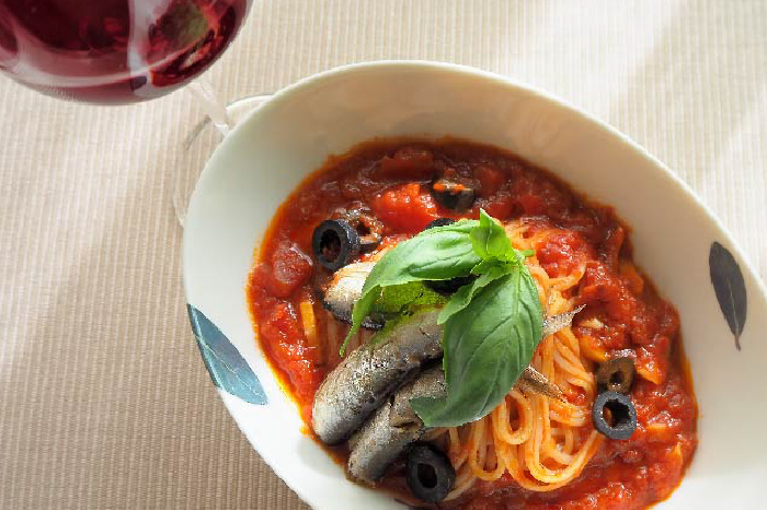 オイルサーディンとオリーブを使った、トマトベースパスタのアレンジレシピです。