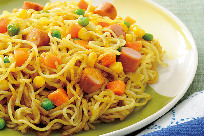 - 2に半田めんを入れてソースを絡めてから火を止め、器に盛りつけます。