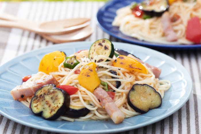 ジューシーな厚切りベーコンと夏野菜の旨みが好相性の一皿です。