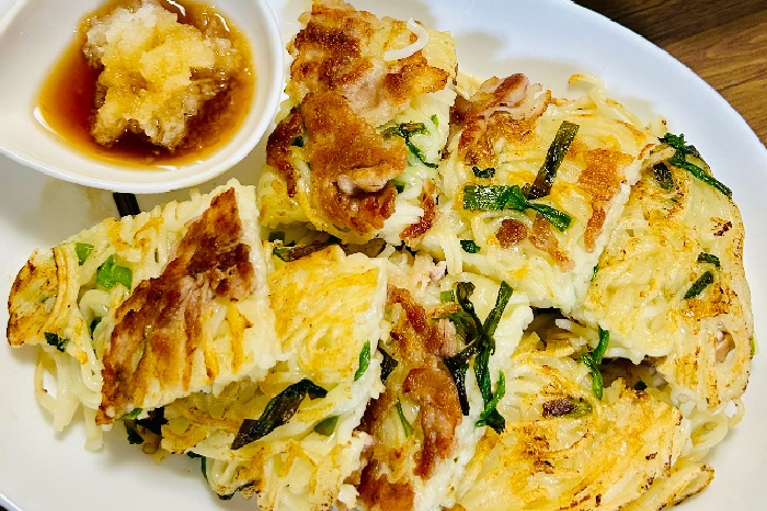 「チヂミ風半田めん」は、具材と半田めんを混ぜ合わせ、チヂミ風に焼き上げたアレンジレシピです。
