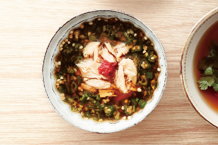 梅だれにツナとねばねばのオクラ・とろろをIN!