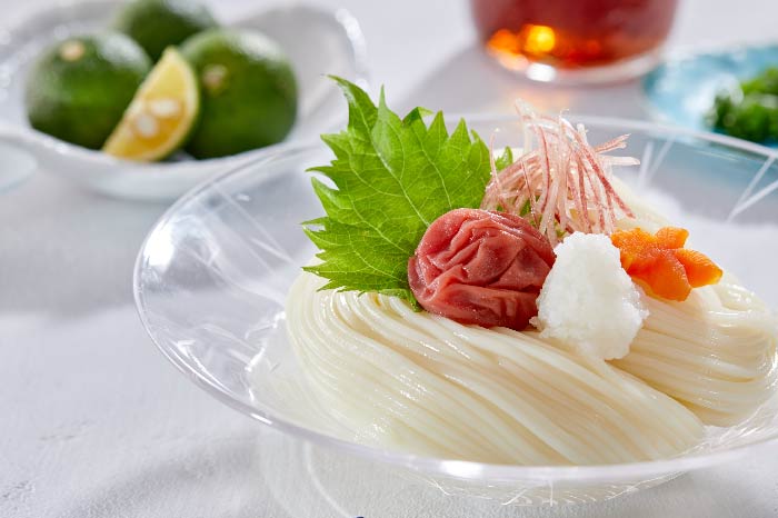 半田めん(半田そうめん)を美味しくお召し上がりいただくために、茹で方ご紹介ページもぜひご覧ください。 - 器にお茶漬けの素(梅)を入れ、氷水(またはお湯)を注いだら半田めん(半田そうめん)盛り付けます。