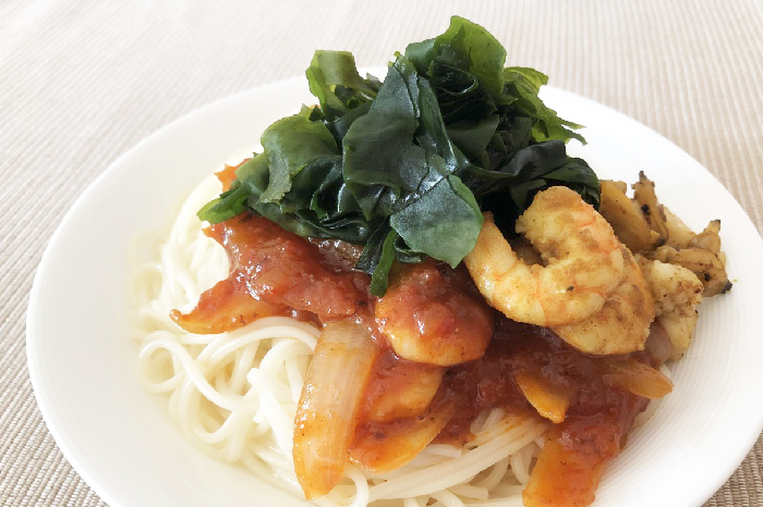 レトルトパスタソースで簡単に!わかめアラビアータ半田めん