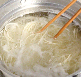大きめの鍋にたっぷりと水を入れ沸騰させます。(麵100gに水1リットルが目安)鍋の中の湯が沸騰すれば麵をパラパラとひろげながら入れます。