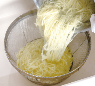 温麺の場合は、湯で時間を約1分短くします。プロセス6のもみ洗いの後に「てぼ」などを使い、もう一度お湯にくぐらせ麺を温めます。