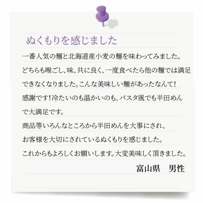 小麦の中心、胚乳部分を厳選した粉のうまみ、歯ごたえ、のど越しを楽しむ麺のおいしさを追求した逸品です。