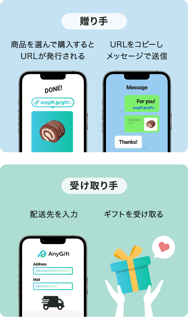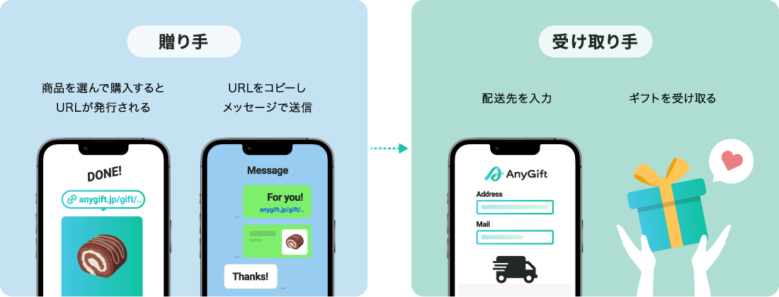 受け取り手はURLからアクセスし、受け取り用ページからご自身で住所や配送日時を入力し、ご都合に合わせてギフトをお受け取りいただけます。