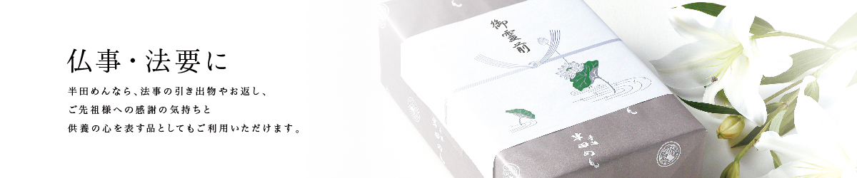 半田めんなら、法事の引き出物やお返し、ご先祖様への感謝の気持ちと供養の心を表す品としてもご利用いただけます。