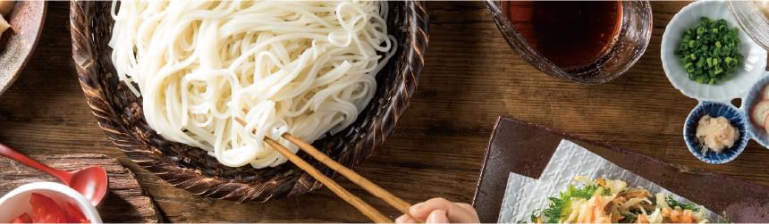 一月から三月までの乾燥した冷風に干された寒ぞうめんは、そうめんの中でも贅沢な逸品。半田独特の麺線が太い半田そうめんは、代々の知恵と努力、そして自然が育んだ伝統の味です。
