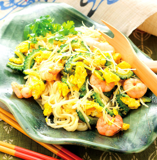 - フライパンに油を熱し、にんにく、ゴーヤ、エビの順に炒める。卵を流し入れてさっと炒め、一度取り出す。